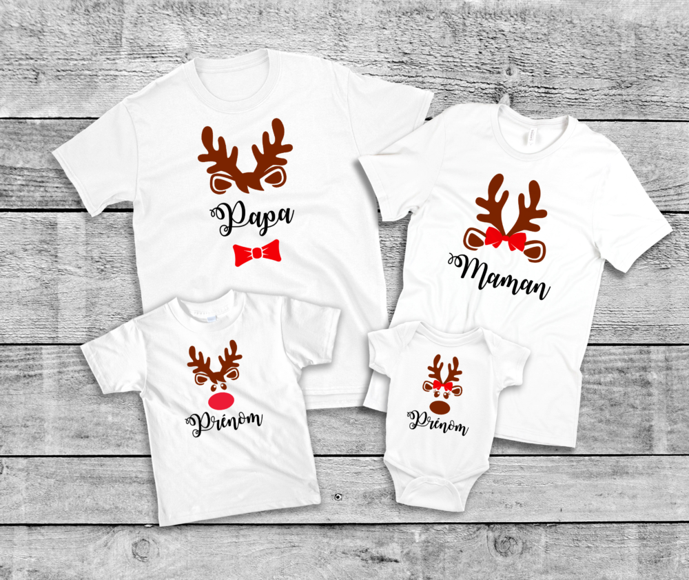 Avec ce tee-shirt renne de Noël à personnaliser, vous aurez vos propres petits Rudolph à la maison. Parfaits pour rester à la maison devant un film de Noël ou bien pour faire sensation auprès de vos proches. Pour le jour ou la nuit, il vont vous accompagner où vous voudrez.